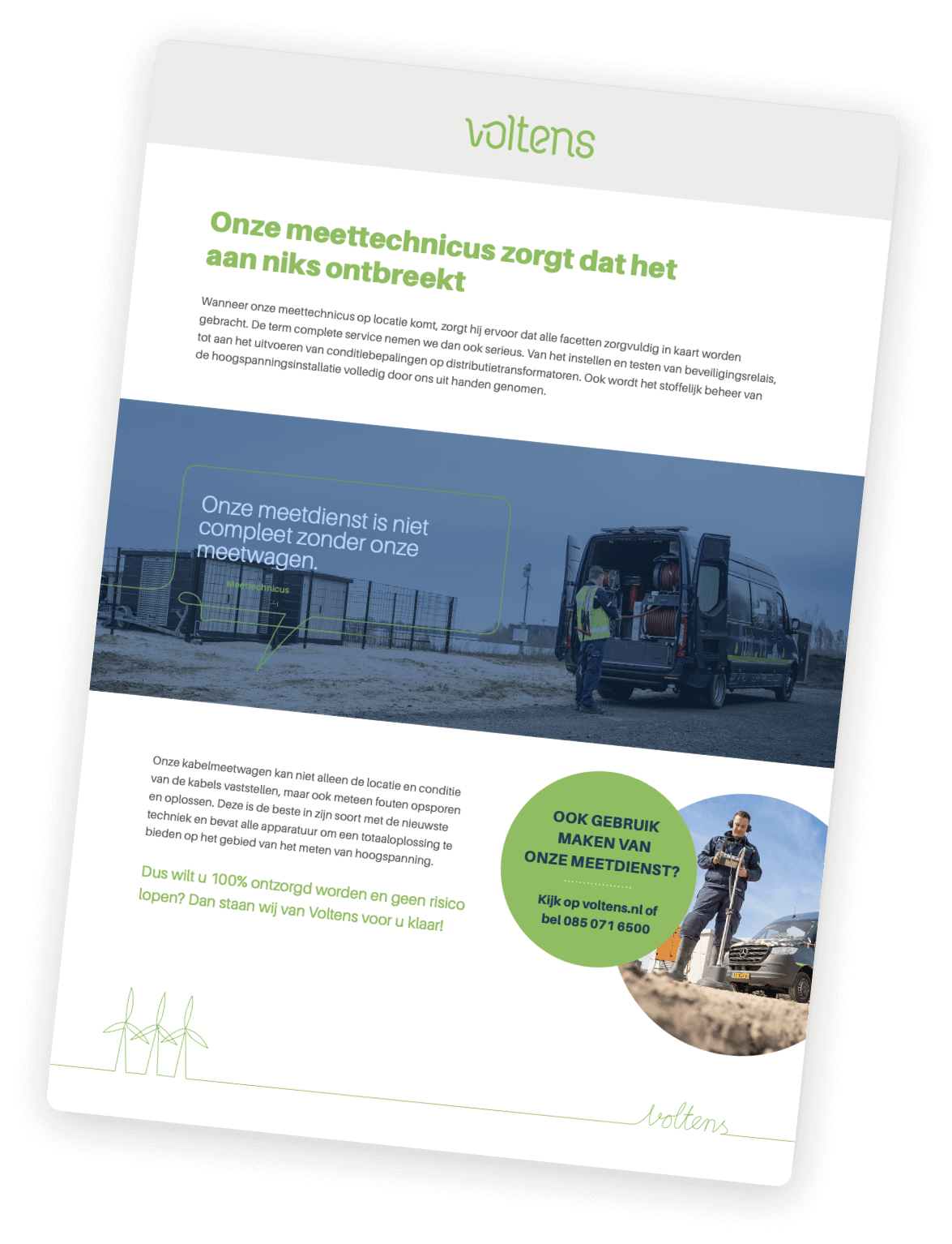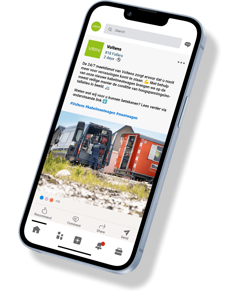 Effectieve communicatie Om de doelgroep van Voltens zo goed mogelijk te informeren over de voordelen van de meetwagen, hebben we een informatieve leaflet ontworpen. Deze leaflet biedt beknopte informatie over de kabelmeetwagen. Daarnaast hebben we aansprekende nieuwsbrieven ontwikkeld om klanten van Voltens op de hoogte te brengen van deze nieuwste ontwikkeling! Ook op de verschillende social media kanalen van Voltens mocht dit nieuws niet ontbreken.